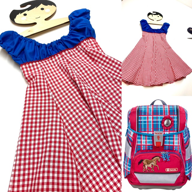 Wir bieten die Kleider in zwei Formen an: als Drehkleid in geschwungener Form (fällt ausreichend, aber schmal aus) und als A-Form mit kurzen Ärmeln. Farblich werden sie abgestimmt auf die Schultüte oder den Schulranzen.
