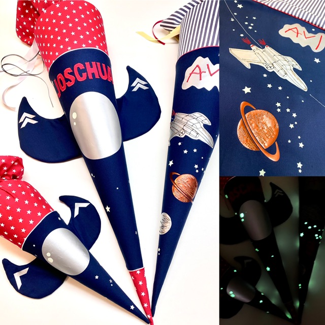 Umkreise mit dieser Schultüte als Astronaut mit dem Starfighter oder Raumschiff verschiedene Planeten und fliege durch die nachtleuchtende Milchstraße. Die metallischen Elemente, wie auch der Name, sind aus Plotterfolie aufgebügelt und jeweils benäht. Die Sterne leuchten in der Nacht!